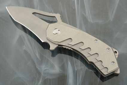 A glass bead blasted grade 5 titanium frame ensures this mid-size folder will be light in the pocket, yet have tremendous strength and durability. Each side features dyed and stabilized warthog tusk inlay. Screws throughout were made in the Arno Bernard workshop and are grade 4 titanium, allowing them to be anodized. Ensuring rigid, yet light construction, the backspacer is grade 5 titanium.
