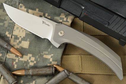A glass bead blasted grade 5 titanium frame ensures this mid-size folder will be light in the pocket, yet have tremendous strength and durability. Each side features African wild olive wood inlay. African wild olive(Olea europeae sub sp. Africana) is a South African hardwood. It is a hard, dense timber and is tremendously resilient -- exactly what we would hope for in a knife handle. The buttery yellow wood has a nice mix of light and dark tones. Screws throughout were made in the Arno Bernard workshop and are grade 4 titanium, allowing them to be anodized. Ensuring rigid, yet light construction, the backspacer is grade 5 titanium.
