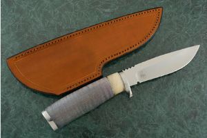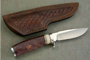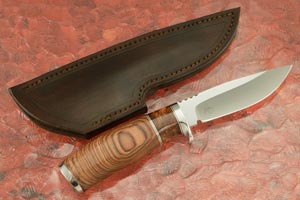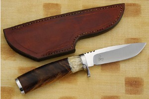 I made my first knife in 1976, and in 1996 my wife Judy and I decided to go into the knife business full time. I make mostly upscale working hunting knives with a bowie or miniature now and again. Each knife is a unique combination of materials. Although I have used many different steels, I have found 440-C to be the most versatile. Heat treated to 57 Rockwell for optimum edge retention and ease of sharpening, this steel has proven itself in both working and collector knives. Other steels will be used for special order, and I enjoy using Damascus for collector pieces.