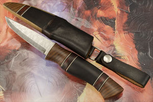 Damascus Drummer Puukko with Teak, Rosewood, African Blackwood and Fine Silver |