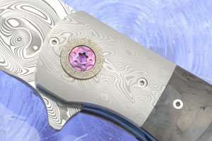 Bolster: Damasteel stainless damascus with a Damasteel pivot collar and custom anodized titanium pivot