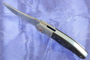 The hollow ground blade is formed from Grosse Rosen pattern damascus forged by Damasteel in Sweden. The blade has smooth action and is easily opened with one hand using the ambidextrous flipper toggle. It uses the IKBS (Ikoma Korth Bearing System) pivot system. This mechanism, which was originally designed to fit balisong knives, uses ball bearings to create exceptional action with no blade play. This special folder is made with ceramic ball bearings. Generally IKBS bearings are made either from tool steel or from stainless steel. Stainless steel can wear away, resulting in uneven action over time. Tool steel bearings can oxidize making the action rough. Ceramic bearings are the best of all worlds -- extremely hard and wear resistant, they are also inert and will not oxidize.