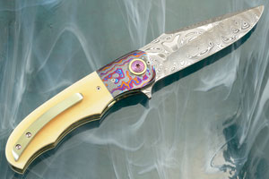 The hollow ground blade is formed from Grosse Rosen pattern damascus forged by Damasteel in Sweden. The blade has smooth action and is easily opened with one hand using the ambidextrous flipper toggle. It uses the IKBS (Ikoma Korth Bearing System) pivot system. This mechanism, which was originally designed to fit balisong knives, uses ball bearings to create exceptional action with no blade play. This special folder is made with ceramic ball bearings. Generally IKBS bearings are made either from tool steel or from stainless steel. Stainless steel can wear away, resulting in uneven action over time. Tool steel bearings can oxidize making the action rough. Ceramic bearings are the best of all worlds -- extremely hard and wear resistant, they are also inert and will not oxidize.