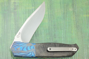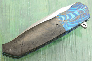 Handle scales are formed from marble carbon fiber. Jimping on the thumb ramp provides a comfortable, secure grip. The gently rounded handle feels sturdy and fills out the hand perfectly. Titanium bolsters are hand engraved and textured with an image of a camoflaged zebra by Marietjie Thorburn, ensuring an elegant, positive grip. The handle is completed with blue anodized titanium liners surrounding a black G10 backbar. The 3D machined titanium pocket clip with ceramic retention ball is mounted for right-handed, tip-up carry.