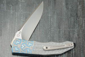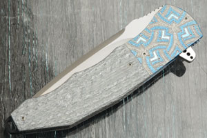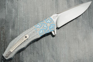 Titanium bolsters are hand engraved, textured, and differentially anodized by Marietjie Thorburn, ensuring a positive grip. Titanium liners are anodized blue. The liners surround a black G10 backbar which extends beyond the end of the handle for an integral lanyard hole. The 3D machined titanium pocket clip with ceramic retention ball is mounted for right-handed, tip-up carry.
