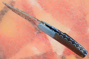 The drop point blade is formed from Thor pattern stainless damascus forged by Damasteel in Sweden. This high performing stainless damascus is created using powder metallurgical steel manufacturing to provide excellent edge retention and unmatched beauty. The high contrast pattern is revealed in the grinds. The flats are mirror polished nearly hiding the pattern. The blade is hollow ground for an easy to maintain edge.