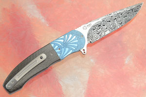 Handle scales are formed from carbon fiber. Jimping on the thumb ramp aids grip. The flipper doubles as a front guard that keeps the hand from sliding forward onto the blade. The gently rounded handle feels sturdy and fills out the hand perfectly. Titanium bolsters are hand engraved, textured, and anodized by Marietjie Thorburn, ensuring a positive grip. The handle is completed with blue anodized, fileworked titanium liners that elegantly complement the scales. The 3D machined titanium pocket clip is mounted for right-handed, tip-up carry and features a ceramic ball for excellent pocket retention.