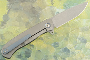 The handle is made from textured Grade 5 titanium and features a handsome bead blasted finish. A front scale is made from textured marble carbon fiber and keeps the knife under 3 oz! Trevor's maker mark (TBC) is engraved into the lockside of the handle. The titanium backbar, pivot collar, and pocket clip are all anodized blue. The pocket clip is mounted for right-handed, tip-up carry.