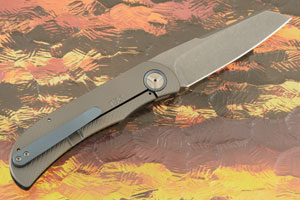 The handle is made from machine textured Grade 5 titanium and features a carbon fiber front. Trevor's maker mark is engraved into the lockside of the handle. The backbar is made from matching carbon fiber. The titanium pivot collar and pocket clip are anodized blue. The pocket clip is mounted for right-handed, tip-up carry.