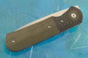 The handle combines green canvas Micarta with lightning strike carbon fiber bolsters. Brass wires are woven through the carbon fiber strands. The combination of green canvas Micarta and lightning strike carbon fiber is particularly dramatic. A green canvas Micarta pivot collar surrounds the custom pivot. Bronze anodized titanium liners surround a matching lightning strike carbon fiber backbar. A bronze anodized, orange peel textured titanium pocket clip is mounted for right-handed, tip-up carry.