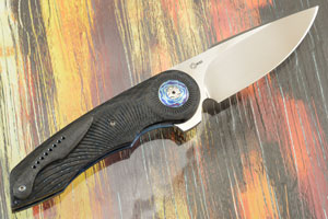 The scales are formed from contoured and carved carbon fiber. A terraced Timascus titanium damascus pivot ring adds flash. Blue anodized titanium liners surround a carbon fiber back spacer. The textured and anodized zirconium pocket clip is mounted for right-handed, tip-up carry.
