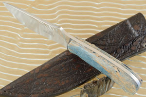Stabilized and dyed giraffe bone handle scales are set to the full tang using five stainless steel pins.