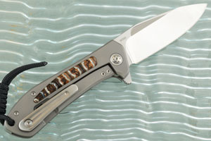 A glass bead blasted titanium frame ensures this mid sized folder will be light in the pocket, yet have tremendous strength and durability. Each side features a stabilized mammoth molar inlay. The 30,000 year old tooth is elegant and dramatic. It will be easy to keep the Orca Flipper close at hand using the titanium pocket clip, mounted for tip-up, right-hand carry.