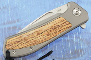 A glass bead blasted titanium frame ensures this mid sized folder will be light in the pocket, yet have tremendous strength and durability. Each side features a giraffe bone inlay. It will be easy to keep the Orca Flipper close at hand using the titanium pocket clip, mounted for tip-up, right-hand carry.