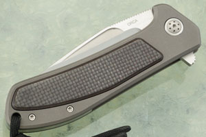 A glass bead blasted titanium frame ensures this mid sized folder will be light in the pocket, yet have tremendous strength and durability. Each side features a red/black carbon fiber inlay. It will be easy to keep the Orca Flipper close at hand using the titanium pocket clip, mounted for tip-up, right-hand carry.