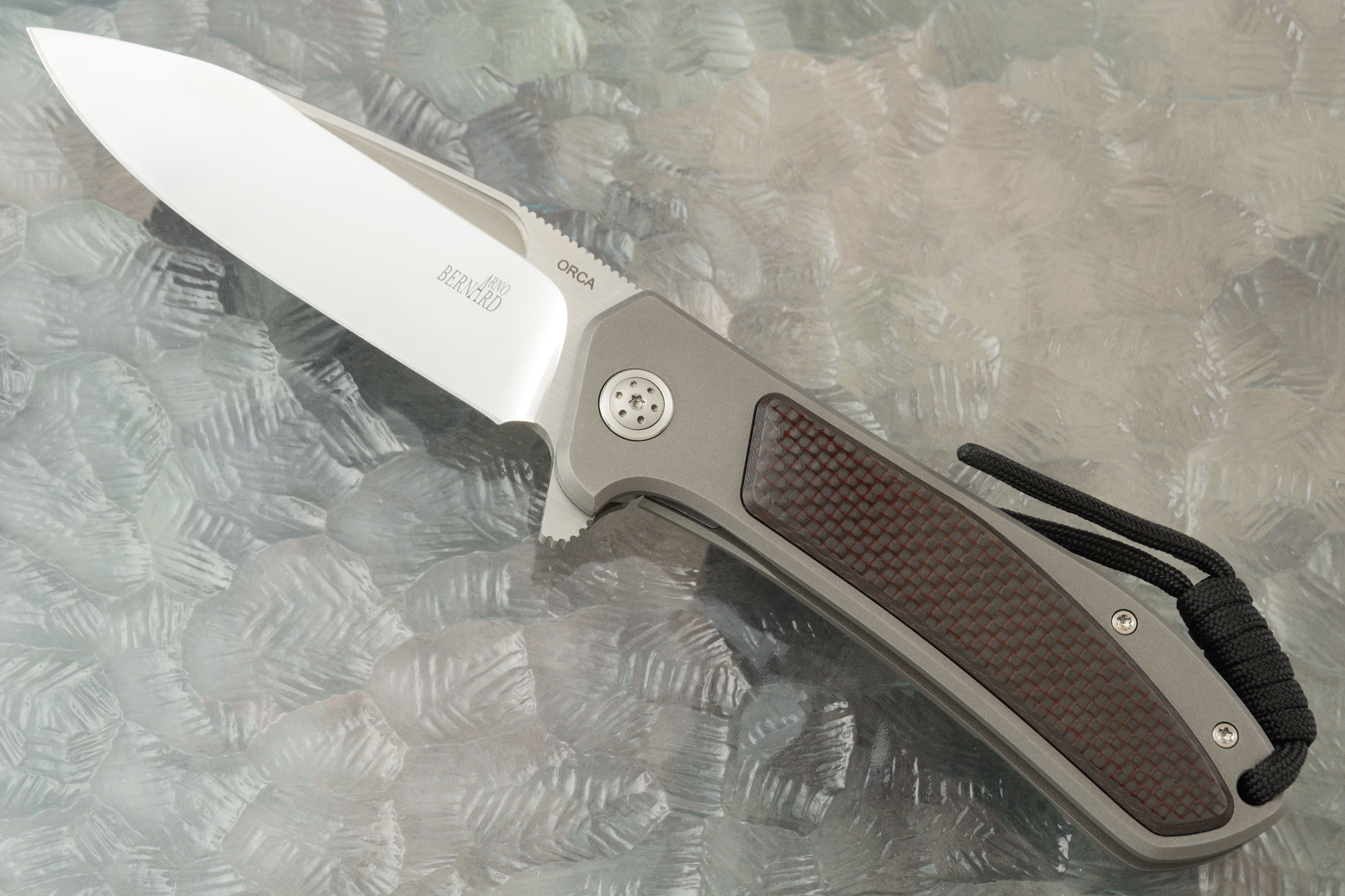 A glass bead blasted titanium frame ensures this mid sized folder will be light in the pocket, yet have tremendous strength and durability. Each side features a red/black carbon fiber inlay. It will be easy to keep the Orca Flipper close at hand using the titanium pocket clip, mounted for tip-up, right-hand carry.