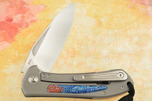 A glass bead blasted titanium frame ensures this mid sized folder will be light in the pocket, yet have tremendous strength and durability. Each side features a merino hybrid sheep horn inlay. It will be easy to keep the Orca Flipper close at hand using the titanium pocket clip, mounted for tip-up, right-hand carry.