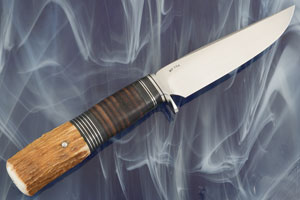 Description: Styled after the knives of William Scagel (one of the best known makers of the early 20th century), this classic clip point hunter has everything that you would expect from ABS Mastersmith P.J. Tomes. The fit throughout is excellent, from the soldered guard to the spacers and handle material.