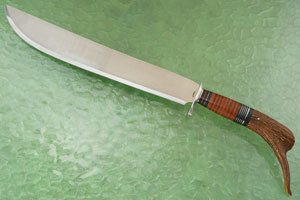 The Scagel style handle (a hallmark of Tomes' work), is exceptionally well done. The handle combines stacked black fiber with thinner nickel spacers and stacked leather. A polished 416 stainless steel guard stops your hand from sliding forward onto the blade. The handle is completed with a stag 'pommel' with a single tine.