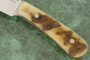 Sheep horn handle scales are set on the full tang for strength and durability. The distal tapered blade and tang provide a perfect balance. This is a knife that will feel very comfortable used for hours at a time.