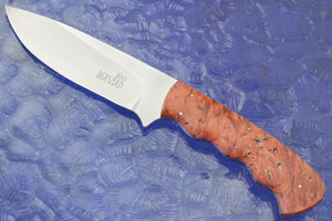 The handle is made from stabilized and dyed birdseye maple set to the tang using stainless steel pins. The dramatic wood combines a swirling figure with 'eyes'. By stabilizing the wood, Bernard combines a dramatic appearance with durability.