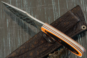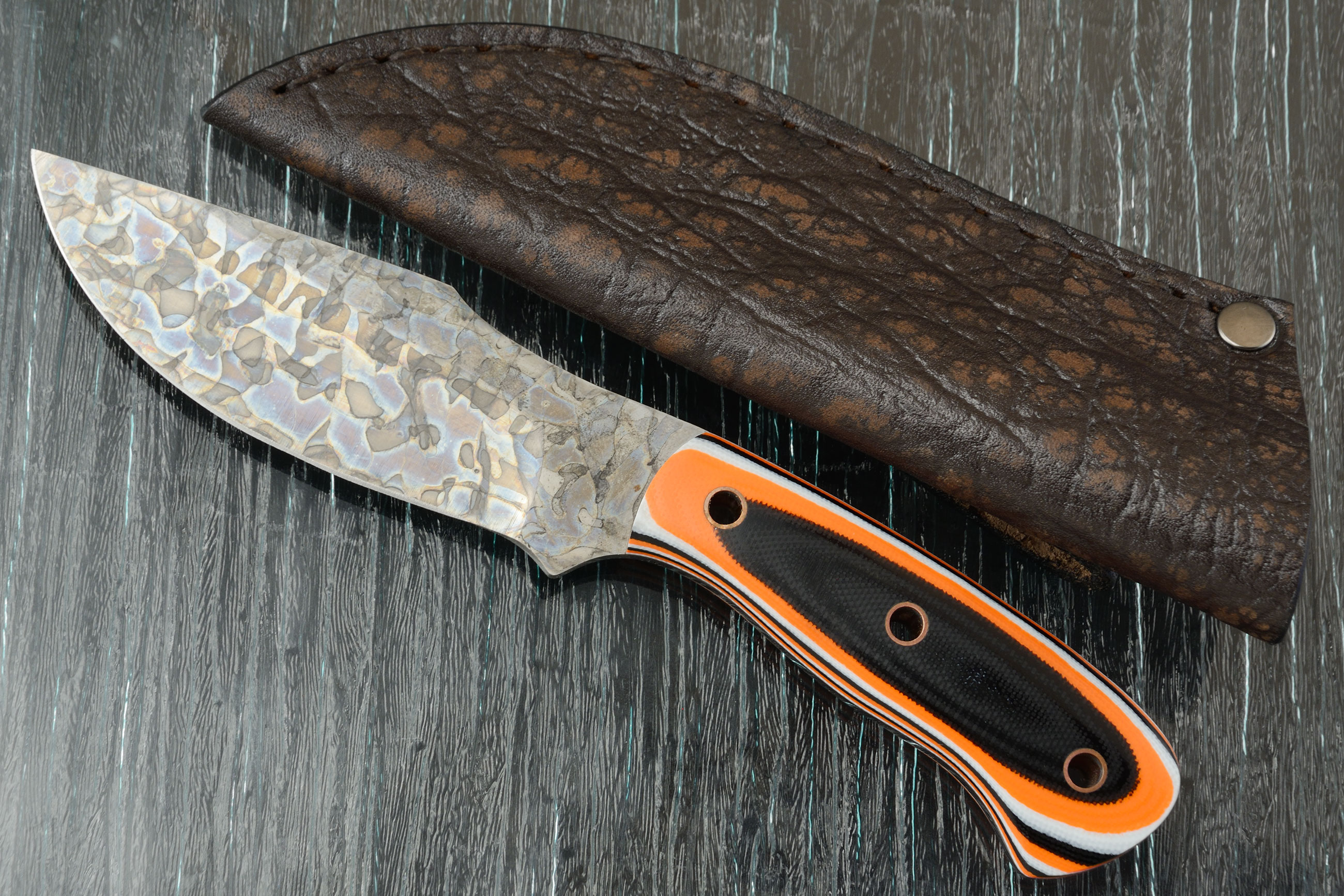 Orange, white and black G-10 handle scales are set to the full tang using stainless steel tube-style pins.
