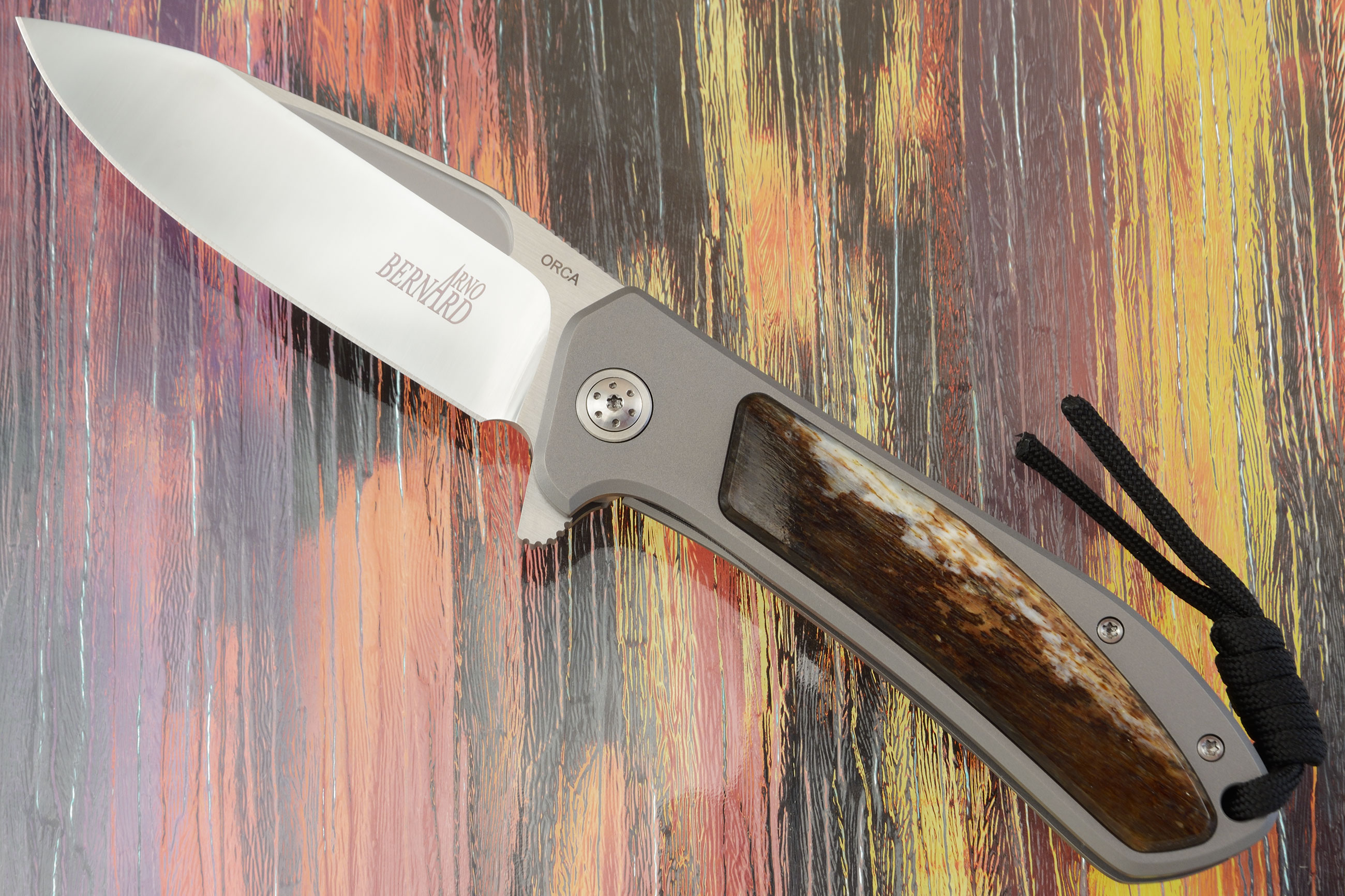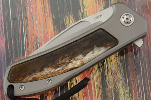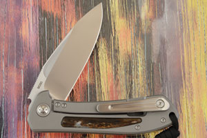 A glass bead blasted titanium frame ensures this mid sized folder will be light in the pocket, yet have tremendous strength and durability. Each side features a giraffe bone inlay. It will be easy to keep the Orca Flipper close at hand using the titanium pocket clip, mounted for tip-up, right-hand carry.