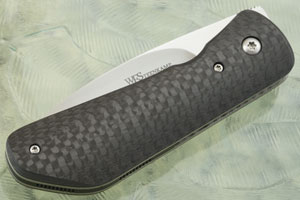 Handle scales are made from carbon fiber. The titanium liners and pocket clip are textured. A carbon fiber back spacer keeps the knife strong yet light. The textured titanium pocket clip is mounted for right-handed, tip-up carry.