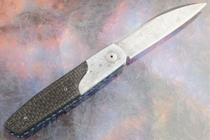 The handle is made from silver strike carbon fiber fit in an S-curve to hardened Damasteel bolsters. By hardening the bolsters and backbar, Des ensures they are more difficult to scratch and take a better etch. The scales are set on blue anodized and fileworked titanium liners that keep the knife light, yet strong.