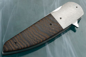 Panga pango wood scales are fit perfectly to textured stainless steel bolsters. Panga panga (Millettia stuhlmannii) is native to Eastern Africa. The chocolate brown wood has similar tones to wenge, combining lighter and darker striations that nicely reflect patterns textured steel bolsters. Titanium liners keep the knife light, yet strong and surround a stainless steel backbar.