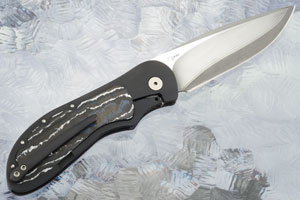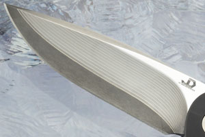 The drop point blade is formed from stainless damascus san mai. A central bar of Takefu SG2 powdered metallurgical stainless steel is surrounded by alternating layers of stainless steel and nickel. At Hrc 63-64, this folder has among the best edge holding of any van Deventer knife ever made. The resulting damascus is high contrast and immediately captivating. The linear damascus reveals JD's complex, super-clean grind. The flats are mirror polished. The blade is hollow ground for an easy to maintain edge.