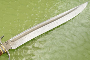 Stuart forged this bowie blade from his own damascus. It is high contrast, extremely detailed, and shows tremendous skill at the forge. A deep fuller travels along each side of the blade.