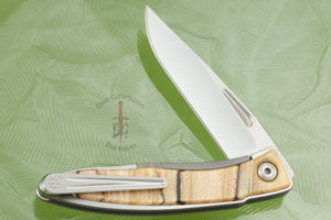This Mnandi features spalted beech wood scales. The scales are inlaid into the frame rather than being simple overlays. The blade is made from S35VN stainless steel, hardened to 58-59 Rc for strength and keen edge retention. Both the frame and pocket clip are formed from 6Al4V titanium, keeping this knife extremely light and durable. The clip is mounted for tip up carry. The knife can be comfortably opened and closed with one hand and locks open for safety. The thumb rest is fileworked for dependable handling. The Mnandi features a strong integral locking mechanism that Chris Reeve popularized.