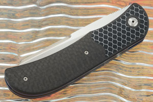 The handle is formed from carbon fiber with precision fit green C-Tek resin infused aluminum honeycomb "bolster" inlays. C-Tek is a material that has been "in the works" since 1995. The material is absolutely stunning in its appearance and its ability to reflect light and gives a whole new depth to the knife making art. An integral carbon fiber pivot ring surrounds the custom pivot. The inlays are flawless with the transition between the two materials being nearly invisible. Blue anodized titanium liners surround the carbon fiber back spacer. The handle is completed with a 3D machined, dark blue anodized titanium pocket clip mounted for right-handed, tip-up carry.