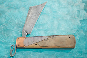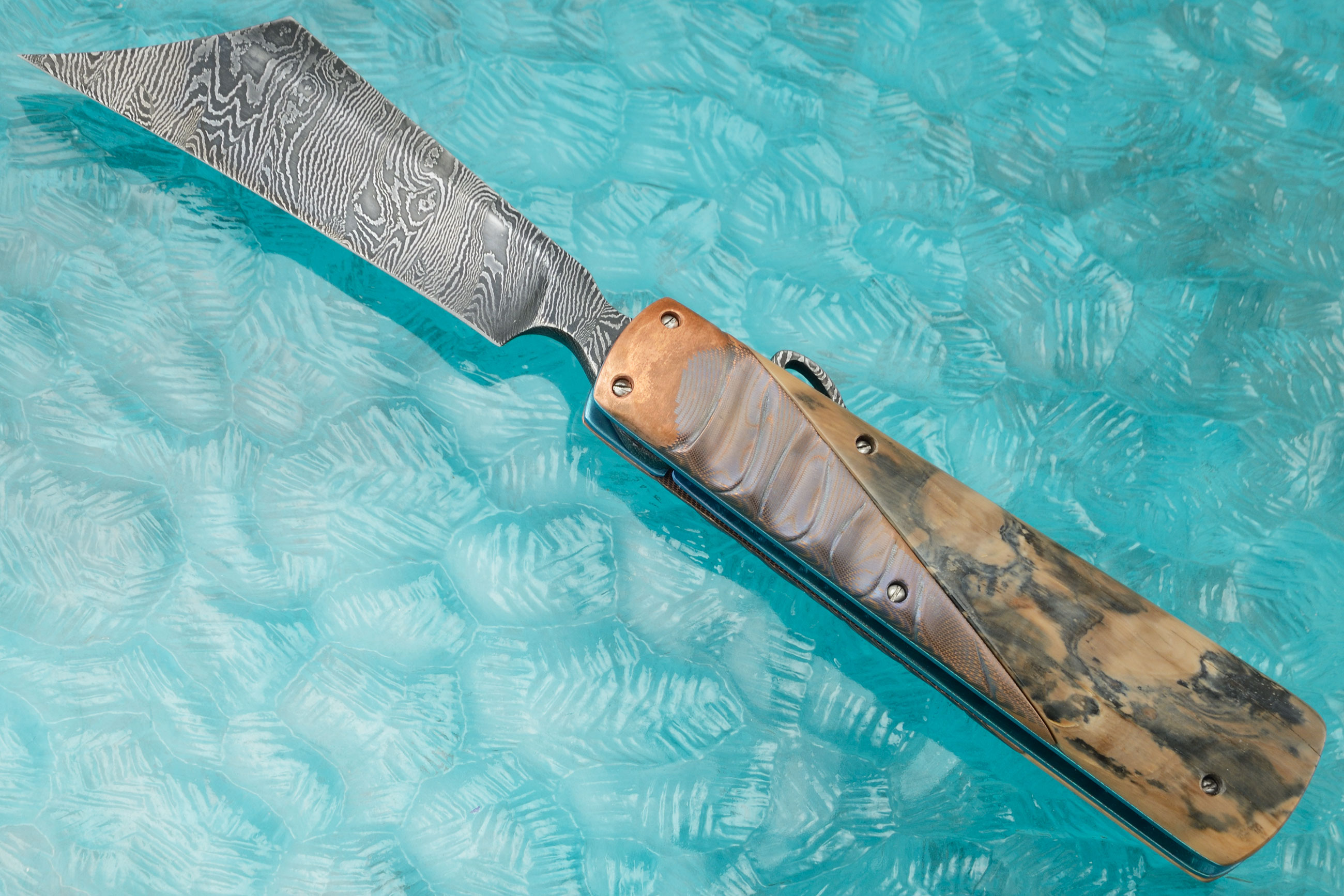 Mardi drew his inspiration for this knife from European straight razors. He forged the damascus from 1080 and 15N20 carbon steels. The bold twisted Ws pattern is nicely visible from a distance. A large choil and thumb notch make it easy to choke up for more delicate cutting tasks. The clipped blade moves into a razor sharp tip. It can be easily rotated out with one hand using the integral front tab. A locking liner securely locks it in place.