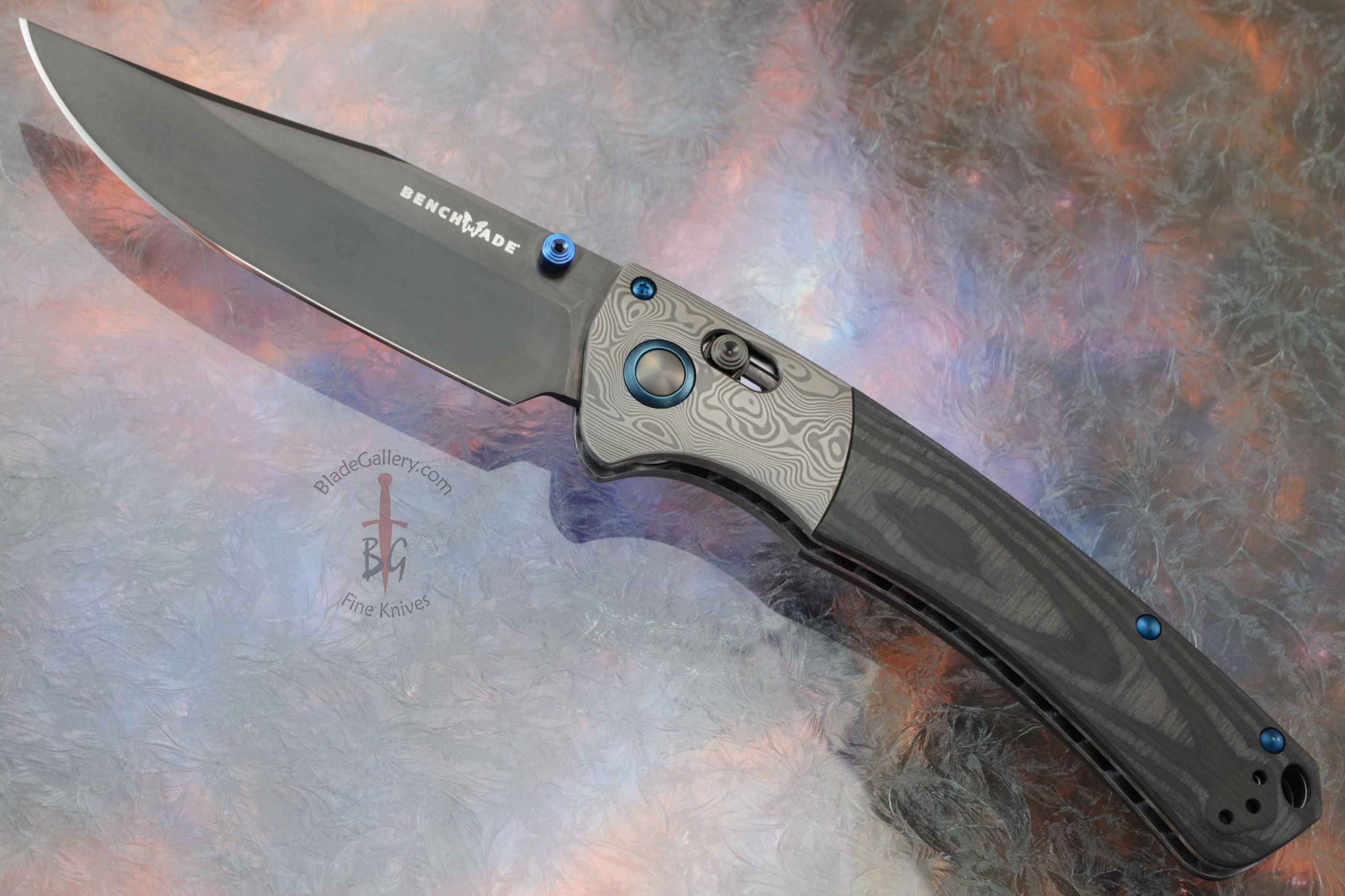 Unidirectional carbon fiber handle scales give off an elegant chatoyancy reminiscent off wood grain. A cracked ice finish, blue anodized titanium backbar keeps the knife light and strong. The reversible cracked ice finished titanium pocket clip is mounted for tip-up carry.