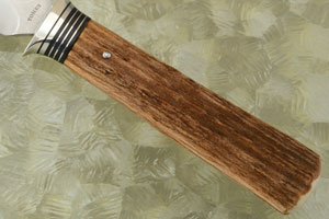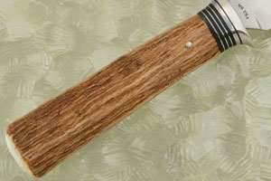 P.J. hand forged the blade from 52100 carbon steel. This high performing steel is considered to be among the best steels (if not the very best) by many knifemakers and knife users. Makers such as Mastersmiths Bill Burke, Bob Kramer, and Ed Fowler have pioneered this long edge holding steel. The blade features a hand rubbed satin finish. P.J.'s mark is on the right side of the blade and MS USA is on the left side.