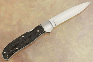 Handle scales are formed from stag bone and are attached with hand domed pins. The scales provide a secure, comfortable grip. This compact knife is lightweight and will comfortably fit in any pocket including the change pocket in a pair of jeans.