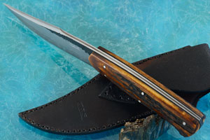 The blade was hand forged from 1095 carbon steel surrounded by 420 stainless steel. This technique, known as san mai (three layers) provides the performance of 1095 carbon steel, with the lower care of stainless steel sides. The transition between the hard center core and the softer sides is particularly dramatic, with a transition line similar to a hamon in appearance. The flats are forge finished. The harpoon tip and recurve cutting edge is a hallmark of their style.