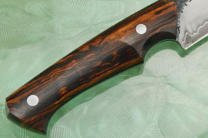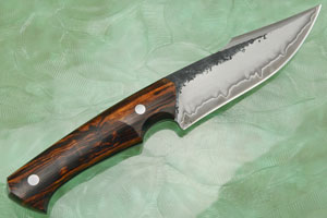 The blade was hand forged from 1095 carbon steel surrounded by 420 stainless steel. This technique, known as san mai (three layers) provides the performance of 1095 carbon steel, with the lower care of stainless steel sides. The transition between the hard center core and the softer sides is particularly dramatic, with a transition line similar to a hamon in appearance. The flats are forge finished. The harpoon tip is a hallmark of their style.