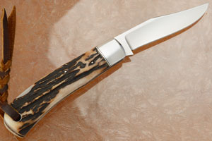 Stag scales are set on hand fileworked stainless steel liners using hand domed pins. An arrowhead escutcheon is inlaid flawlessly into the left stag handle scale. 416 stainless steel bolsters are fit nicely to the stag scales. A rear lanyard tube with a braided leather lanyard makes the knife easy to pull out from your pocket.