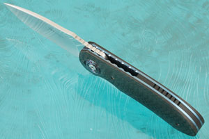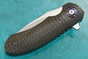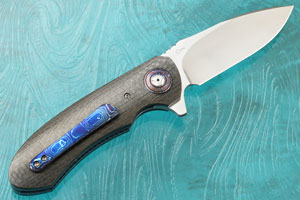 Handle scales are made from carbon fiber. Blue anodized and jewel polished titanium liners surround a matching carbon fiber backbar. Pivot collars are made from White Timascus. The matching 3D machined White Timascus pocket clip is mounted for right-handed, tip-up carry.