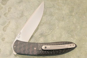 The scales are formed from carbon fiber. Jimping on the thumb ramp provides a comfortable, secure grip. The gently rounded handle feels sturdy and fills out the hand perfectly. This combination nicely complements the differentially finished, textured and engraved zirconium bolsters. The bolsters have an elegant iridescence that is captivating. Zirconium is a transitional metal that is primarily mined in South Africa and Australia. It is highly resistant to corrosion and scuffing. The handle is completed with blue anodized and fileworked titanium liners. The 3D machined titanium pocket clip with ceramic retention ball is mounted for right-handed, tip-up carry.