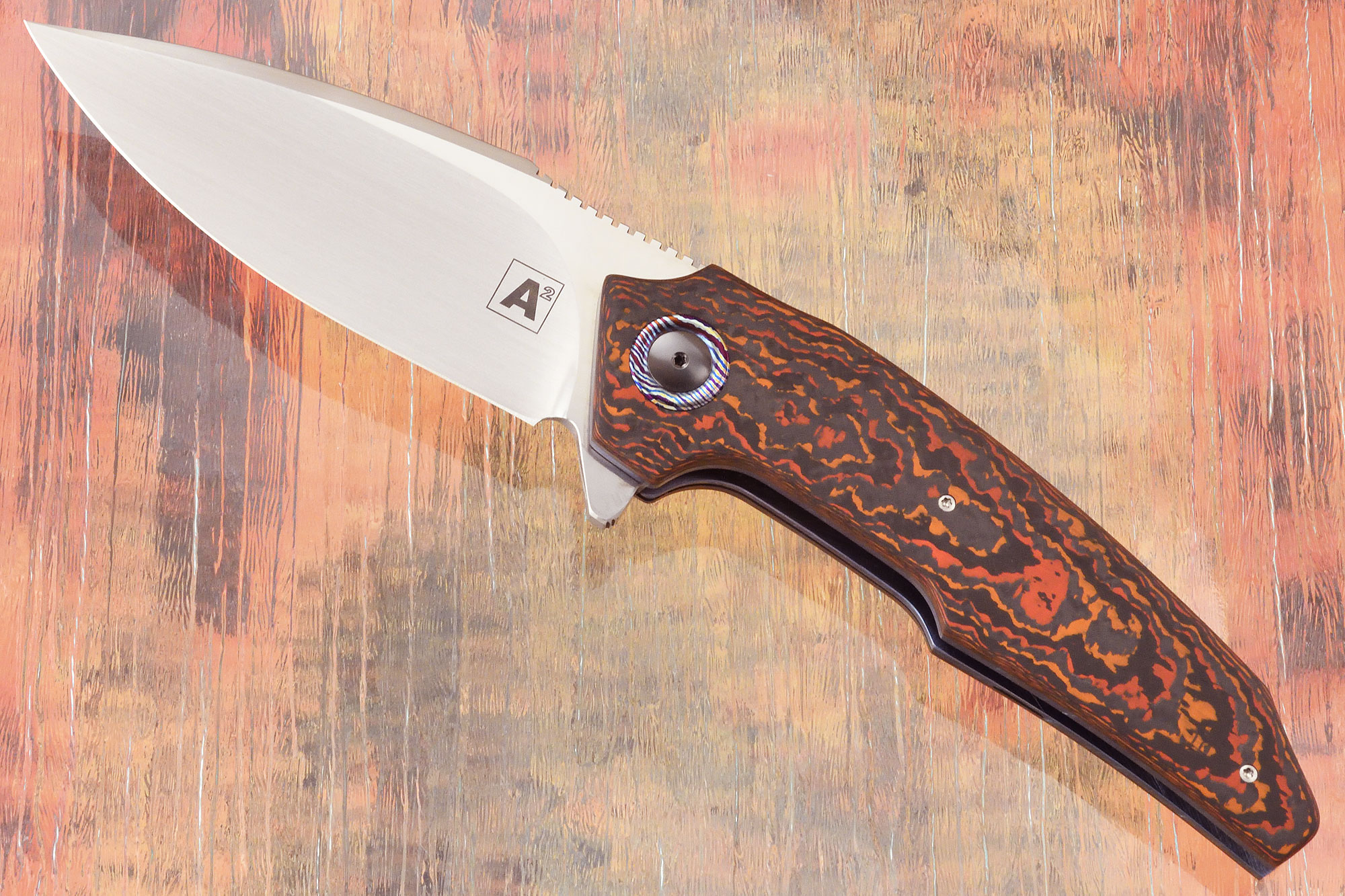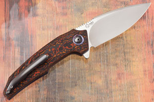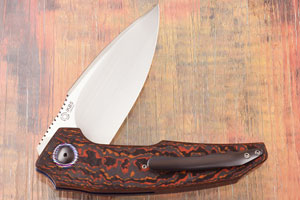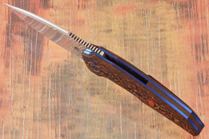 Handle scales are formed from Lava Flow FatCarbon. This dramatic composite material creates a damascene pattern using thin layers of ceramic and carbon fiber. The unique carbon fiber produces a beautiful chatoyancy that reflects light exceptionally. The custom heat colored zirconium pivot is surrounded by a titanium damascus pivot collar. Jimping on the thumb ramp aids grip. The gently rounded handle feels sturdy and fills the hand perfectly. It is completed with blue anodized titanium liners. The 3D machined zirconium pocket clip is mounted for tip-up, right handed carry.