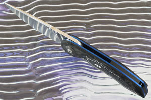 The scales are formed from contoured marble carbon fiber meticulously inlaid with white/blue/black FatCarbon. The custom pivot is surrounded by a terraced zirconium pivot ring. Blue anodized titanium liners surround a carbon fiber back spacer. The textured black titanium pocket clip is mounted for right-handed, tip-up carry.