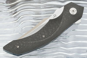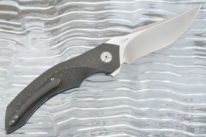 Handle scales are formed from hand fluted carbon fiber. The fluting provides additional grip and adds a unique look. Blue anodized titanium liners surround a carbon fiber backbar. Jimping along the liner lock makes disengaging the lock particularly easy. Texturing on the flipper tab makes it very easy to deploy. The black titanium pocket clip is mounted for right-handed, tip-up carry.