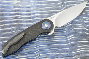 Handle scales are formed from tightly woven carbon fiber with a large weave carbon fiber inlaid beautifully into the handle. This provides a unique look that draws you in for closer examination. A White Timascus titanium damascus pivot ring is meticulously inlaid to add flash. Blue anodized titanium liners surround a carbon fiber backbar and jimping along the liner lock makes the lock particularly easy to disengage. The zirconium pocket clip is mounted for right-handed, tip-up carry.