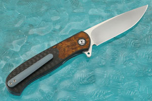 The handle is formed from carbon fiber with precision fit spalted oak burl (Quercus sp.) inlays. An integral carbon fiber pivot ring surrounds the custom pivot. The inlays are flawless with the transition between the two materials being nearly invisible. Blue anodized titanium liners surround the carbon fiber back spacer. The handle is completed with a 3D machined, blue anodized titanium pocket clip mounted for right-handed, tip-up carry.