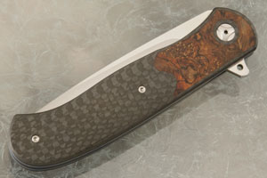 The handle is formed from carbon fiber with precision fit spalted oak burl (Quercus sp.) inlays. An integral carbon fiber pivot ring surrounds the custom pivot. The inlays are flawless with the transition between the two materials being nearly invisible. Blue anodized titanium liners surround the carbon fiber back spacer. The handle is completed with a 3D machined, blue anodized titanium pocket clip mounted for right-handed, tip-up carry.