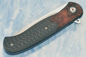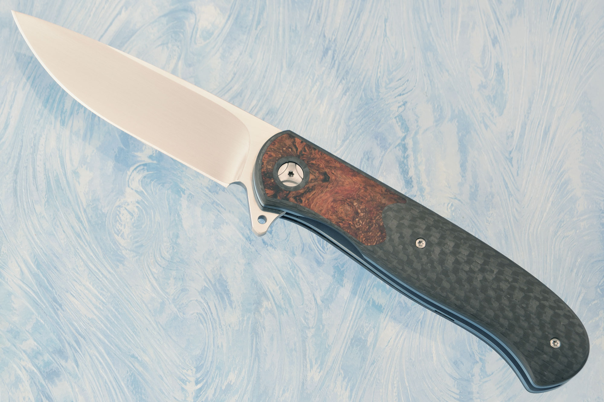 The handle is formed from carbon fiber with precision fit maple burl inlays. An integral carbon fiber pivot ring surrounds the custom pivot. The inlays are flawless with the transition between the two materials being nearly invisible. Blue anodized titanium liners surround the carbon fiber back spacer. The handle is completed with a 3D machined, blue anodized titanium pocket clip mounted for right-handed, tip-up carry.